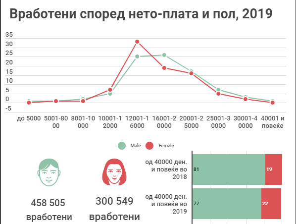 Мажите во земјава заработуваат повеќе во безмалку секоја индустриска гранка – од оние пониско платените, па сè до оние повисоко платени професии. Анализиравме колкава е родовата нееднаквост во повеќе сектори, па дури и во ИТ-индустријата каде исто така откривме дека постои јаз во висината на платите меѓу мажите и жените, дури и на исти или слични позиции. Нашата анализа покажува дека дури петпати повеќе мажи отколку жени земаат плата повисока од 40.000 денари.