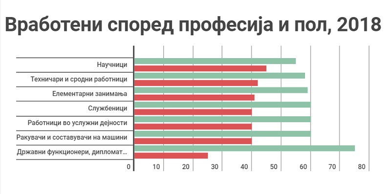 Според Евростат, глобалниот јаз на платите во Европа и во Македонија е скоро ист во однос на мажите и жените, односно мажите заработуваат 15 проценти повеќе од жените. Според Државниот завод за статистика, објавен годинава, видливо е забележана разлика во платите помеѓу мажите и жените. Според нето-платата и според полот, во 2018 година над 40. 000 денари плата земале 19% жени и 91% мажи. Една година подоцна процентот се променил, односно над 40.000 денари плата и повеќе земале 22,4% жени и 77.6% мажи.