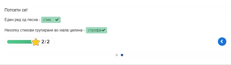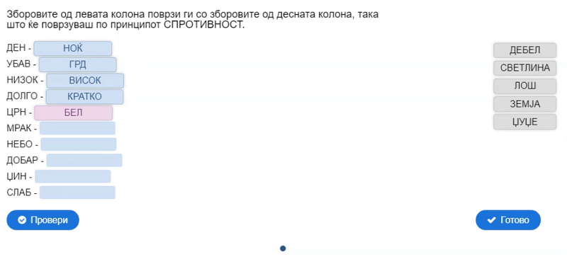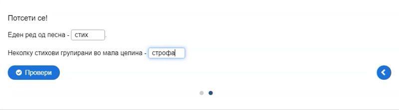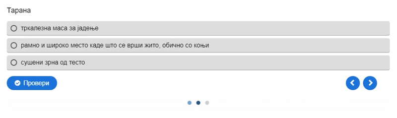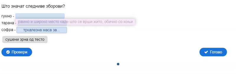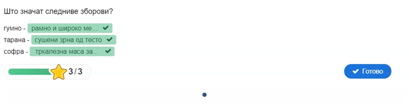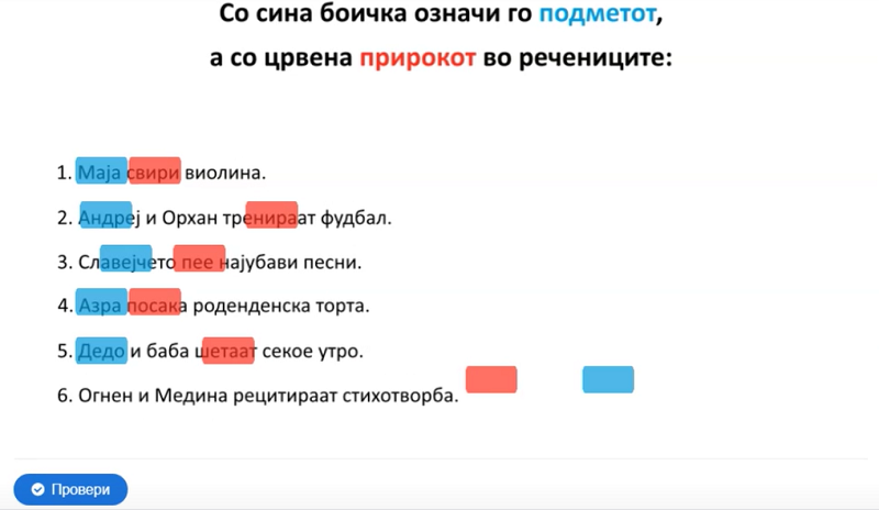 Со сина боја да се означи подметот, а со црвена прирокот во реченицата; што значат зборовите: гумно, софра, тарана; да се одговори што е еден ред од песна, а што неколку стихови групирани во мала целина; да се пронајдат десет зборови во осумнасочник; да се поврзат зборовите од левата со зборовите од десната страна по принципот спротивност…