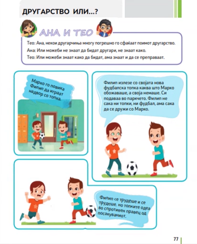 Таа додава дека целиот учебник се темели на трите принципи на новата концепција за основно образование – инклузивност, родова рамноправност и интеркултурност. Во согласност со потребите на современиот свет, во материјалите акцентот е ставен и на медиумската култура и медиумската писменост.