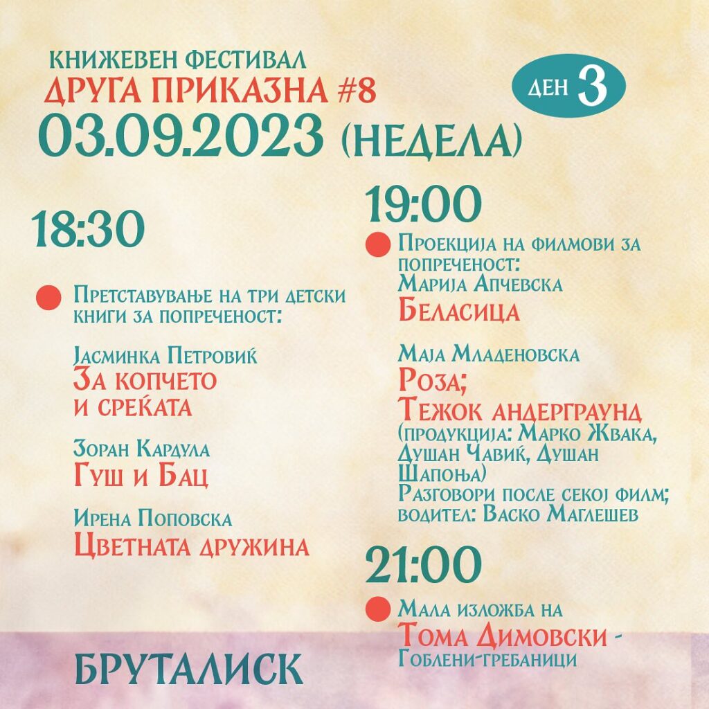 Програмата на третиот и последен ден на Книжевниот фестивал „Друга приказна“ ќе започне денеска во 18.30 часот во културниот центар „Бруталиск“ во Скопје. Најпрво ќе бидат промовирани три детски книги што ја третираат темата за попреченоста. Станува збор за „За копчето и среќата“ од Јасмина Петровиќ, во издание на „Чудна шума“, „Гуш и Бац“ на Зоран Кардула и „Цветната дружина“ од Ирена Поповска. Модератор ќе биде Никола Гелевски.