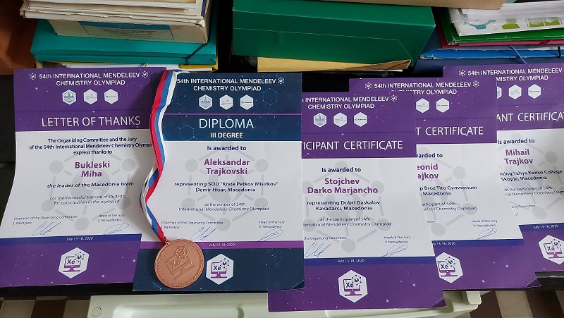 Младите олимпијци што годинава ја претставуваа Македонија на Меѓународната олимпијада по хемија IСhO вчера на Институтот за хемија ги примија медалите и дипломите што им ги додели домаќинот Јапонија. Од Јапонија стигнал посебен пакет за секој учесник, вклучувајќи ги и менторите на учениците. Пристигнал и медалот, дипломите, сертификатите и благодарниците за минатогодишните учесници на Меѓународната олимпијада „Менделеев“.