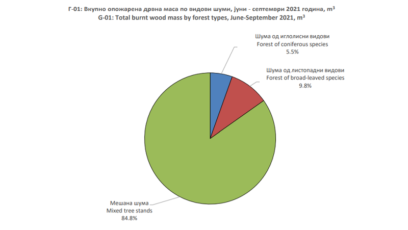 – Од вкупните штети најмногу беа зафатени шумите од мешаните насади – 52,2 отсто. Настрадале 30,2 отсто листопадни видови, 10,1 отсто иглолисни видови си 7,4 отсто приземна вегетација. Опожарената дрвна маса во шумите изнесува 482.106 кубни метри, а износот на проценетата материјална штета изнесува 2 милијарди 318 милиони и 91 илјада денари (околу 37,7 милиони евра н.з.) – соопшти Заводот.