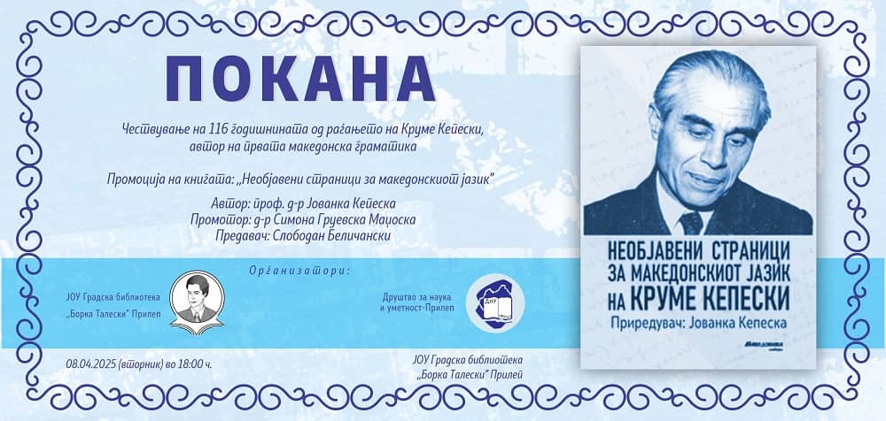 Во Градската библиотека „Борка Талески“ во Прилеп утре во 18 часот ќе бидат одбележани 116 години од раѓањето на Круме Кепески, првиот македонски современ граматичар. Воедно ќе се одржи промоција на книгата „Необјавени страници за македонскиот јазик на Круме Кепески“, приредена од проф. д-р Јованка Кепеска, а која е издание на „Македоника литера“. За книгата ќе зборува проф. д-р Симона Груевска Маџоска, претседателка на Советот за македонски јазик, а за делото на Кепески ќе зборува Слободан Беличански од името на Друштвото за наука и уметност во Прилеп.