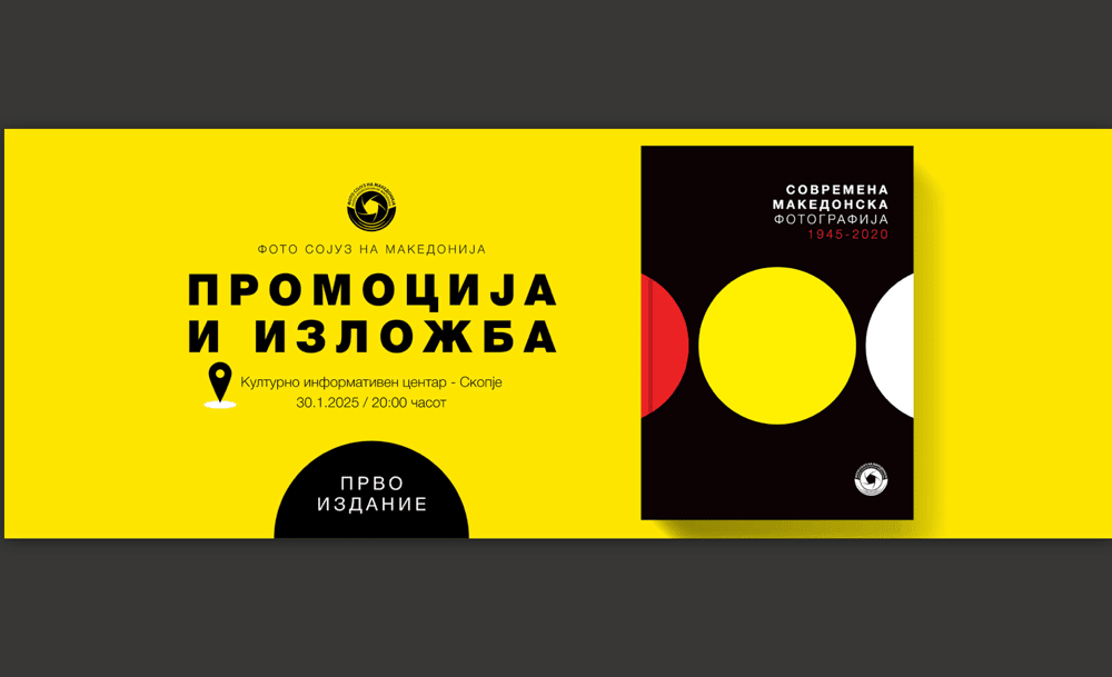 Во организација на Фото сојузот на Македонија, на 30 ноември во 20 часот, во Културно-информативниот центар во Скопје ќе се одржи промоција на монографијата „Современа македонска фотографија – Македонска фотографија 1945-2020“. Монографијата е капитално дело и е единствена од ваков вид, со вовед во историскиот и креативен развој на фотографската уметност во Македонија. Поддржана како проект од национален интерес од страна на Министерството за култура и спонзорирана од Халкбанк – Скопје, монографијата претставува пресек на речиси 80-годишно творештво на автори членови на Фото сојуз на Македонија.