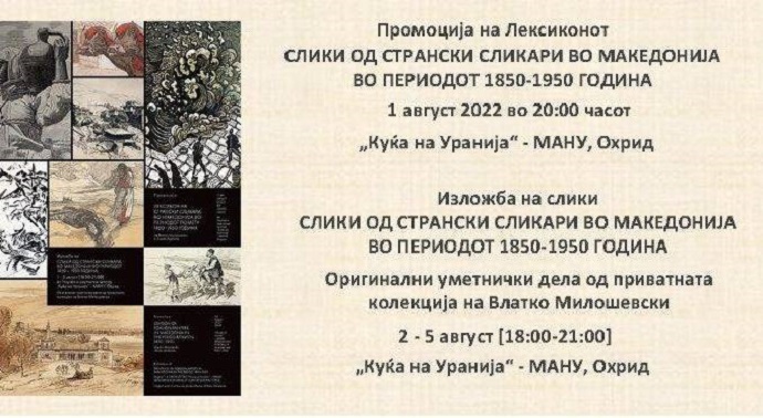 Во научниот и уметнички центар „Куќа на Уранија“ при Македонската академија на науките и умтностите синоќа се одржа промоција на лексиконот „Странски сликари во Македонија во периодот 1850-1950 година“ на авторите Влатко Милошевски и Зоран Андонов. На околу 400 страници претставени се биографиите на 246 странски сликари и 590 фотографии од нивните дела создадени во нашата држава во периодот меѓу 1850 и 1950 година.