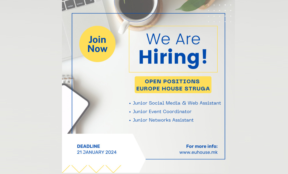 Europе House објави оглас за три работни позиции во новата куќа која ќе биде отвирен аво Струга. Огласите се однесуваат на работните позиции: помлад асистент за социјални медиуми и вебсајт; помлад асистент за мрежи и помлад координатор за локални настани. Повикот трае до 21 јануари, а заинтересираните кандидати треба да испратат биографии на електронските адреси: aneta.spirkoska@gopa-pace.com и euwithyou_mk@gopa-pace.com.