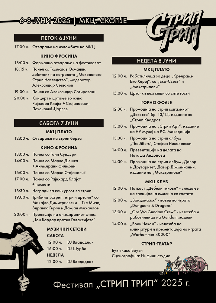 Програмата на „Стрип трип“ вклучува три одделни изложби со стрип-табли и илустрации на гостите и учесниците, а ќе се одржат и низа панели и презентации на некои од најновите домашни и регионални стрип изданија. Фестивалот вклучува и работилница за цртање стрипови со Здравко Гиров, цртачка „џем“ сесија со сите гости, поткаст во живо со Дебели Гикови, и низа други интерактивни искуства. Ќе бидат прикажани и долгометражниот анимиран филм „Јон Вардар против Галаксијата“ на Гоце Цветановски и кратките анимирани филмови на Марко Дјешка. Диџеј сетовите на Костадин Шурбановски-Шурбе и Владимир Благојевиќ-Владодлак ја заокружуваат мултимедијалната програма. Повеќе детали и саатници се достапни на Фејсбук и Инстаграм профилите на „Стрип трип“.