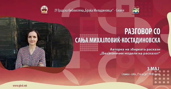Во Градската библиотека „Браќа Миладиновци“ во Скопје вечерва во 19 часот ќе се одржи разговор со Сања Михајловиќ-Костадиновска, авторка на „(Бес)конечни модели на расказот“ – книга за месец мај на библиотеката. Разговорот со Михајловиќ-Костадиновска е дел од големата кампања „Читаме современи македонски автори“, а збирката раскази „(Бес)конечни модели на расказот“ ќе биде тема и на Клубот на читатели предвиден за 26 мај. Разговорот ќе го води книжевната критичарка Александра Јуруковска, а фрагменти од делото ќе чита актерот Андреј Серафимовски.