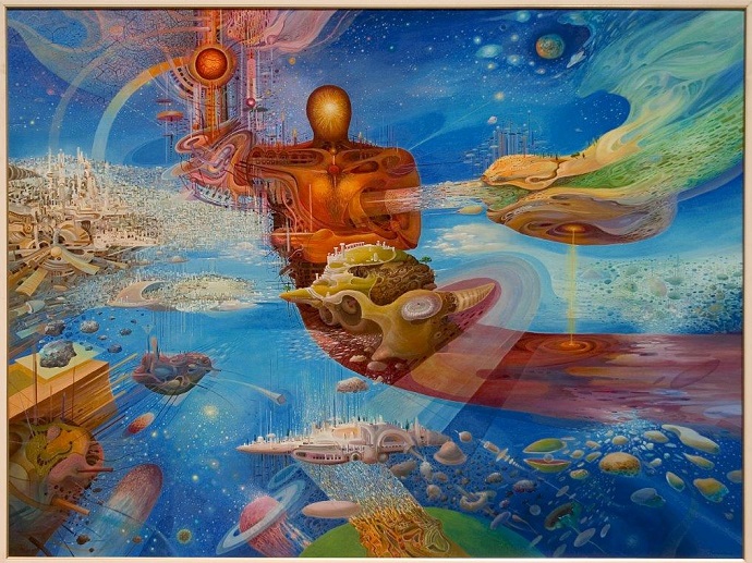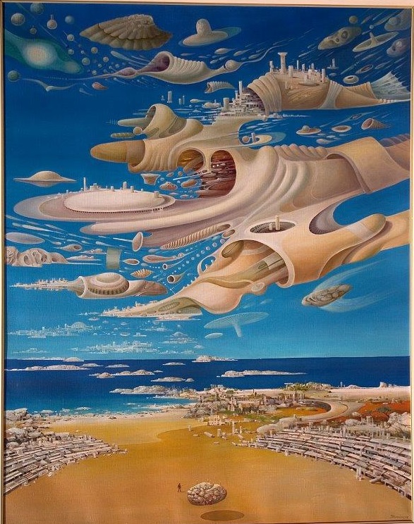 – Сликарската визија на Ташковски се фокусира на човековите излети во космосот, мечтаењата и визијата, бегството од невротичното време во замислени тродимензионални пејзажи најчесто со широк отворен хоризонт со небо и земја во позадината, додека во прв план се поставени структури налик на урнатини, стари храмови, лебдечки егзотични вегетациски оази, во комбинација со биолошко-техницизирани механички структури – вели Чанкуловска-Михајловска.