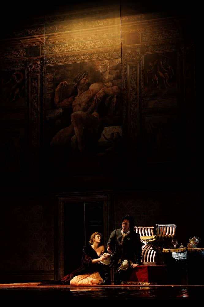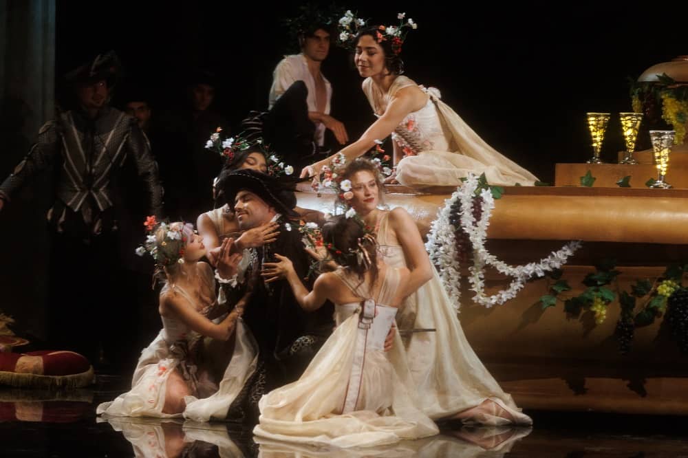 Гилермо Нова од Шпанија создал таква сценографијата, што уште првата сцена неодоливо навлекува на чувството дека гледате филм. Огромната фонтана на кат, украсена со винова лоза и гроздови, надополнета со лелеавите прозрачни женски костими и цветови во косите, и масовната сцена со машкиот хор создава прават подвижна слика создадена од четката на Рембрант. Нежна проѕирна завеса со аплицирани дебелки ангели ја покрива целата сцена и ù дава длабочина на филмско платно.
