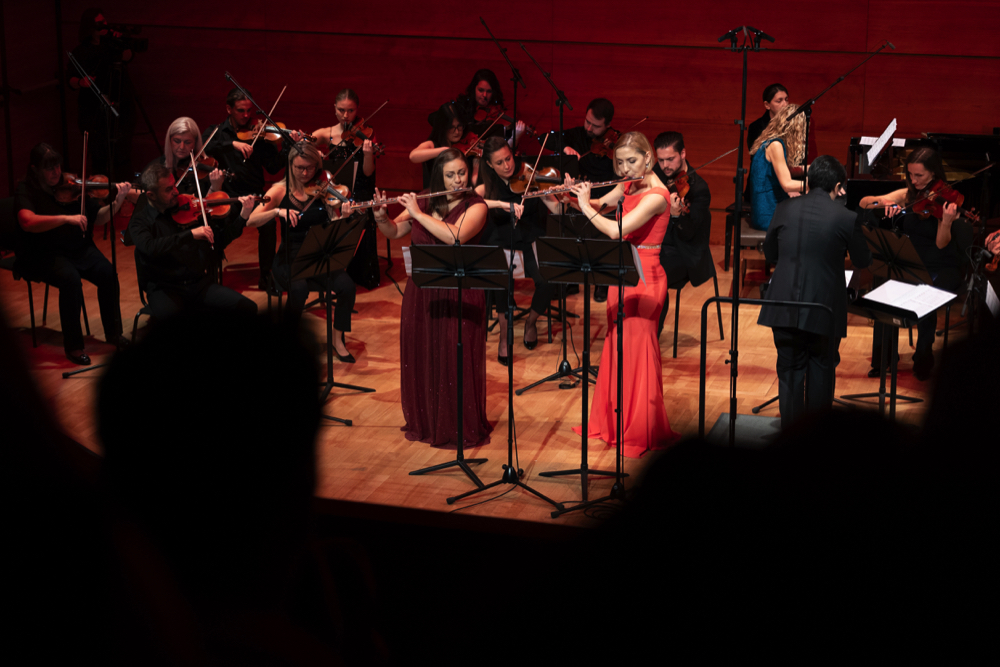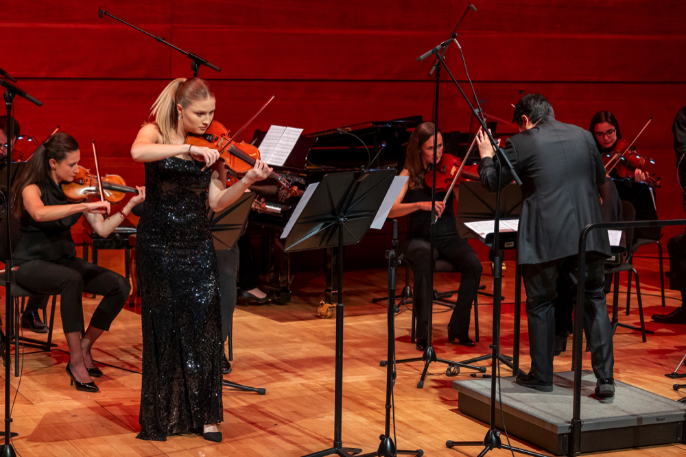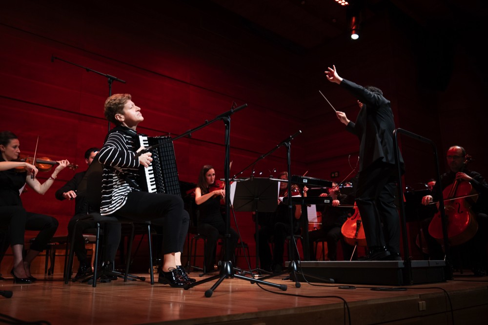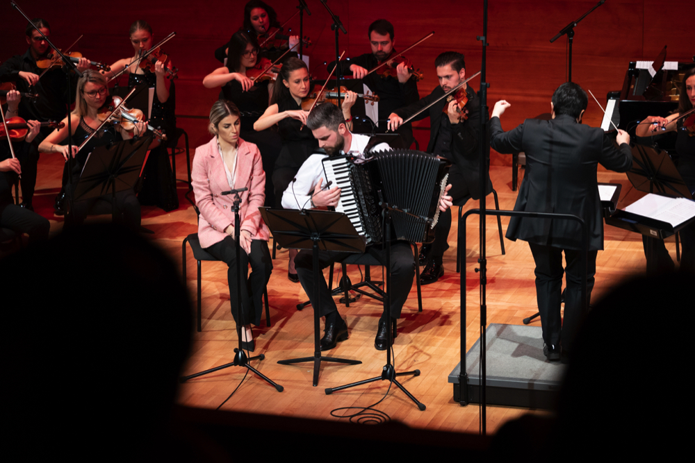 Концертот започна со најмладите изведувачи, Матеска и Мирчевска како дуо хармоники во делото Sunrise, кои веќе прикажуваат уметничка и сценска зрелост и во целост ја оправдуваат привилегијата да се биде во класата на Каракутовска. По ова впечатливо солистичко музицирање со оркестар им посакуваме отворени можности и подготвеност за соочување со музичкиот свет полн со предизвици.