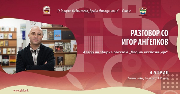 Разговор со писателот Игор Анѓелков за книгата „Двојна експозиција“ ќе се одржи вечерва во 19 часот, во спомен-собата „Т’га за југ“ во Градската библиотека „Браќа Миладиновци“ во Скопје. „Двојна експозиција“ е книга на месец април, во рамките на активностите од големата кампања „Читаме современи македонски автори“. Разговорот ќе го води книжевната критичарка Александра Јуруковска, а фрагменти од делото ќе чита актерот Андреј Серафимовски. Збирката раскази ќе биде тема и на Клубот на читатели предвиден за 29 април.