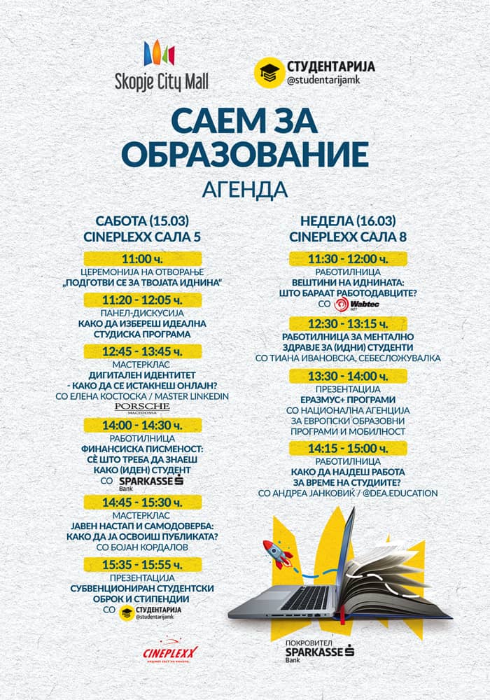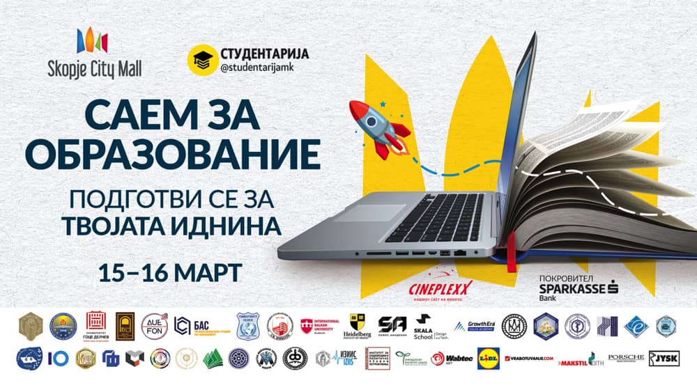 Матуранти и за студенти можат да учествуваат на Саемот за образование што ќе се одржи денеска и утре во Скопје сити мол и ќе претставува уникатна можност за да се информираат за своите академски и кариерни можности. Настанот е во организација на Скопје сити мол и „Студентарија“ најголемата дигитална студентска платформа и заедница во Македонија, а е поддржан од Шпаркасе банка.