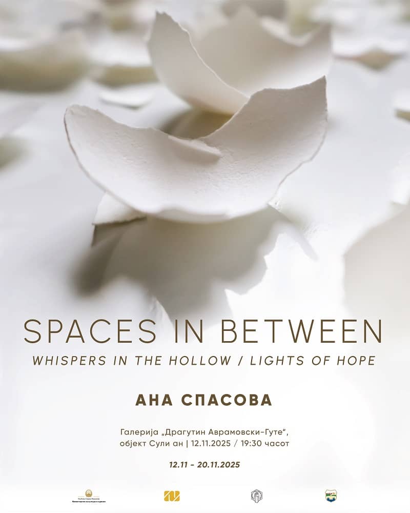 Самостојната изложба „Простори помеѓу / Шепоти во вдлабнатините, светла на надежта“ од Ана Спасова ќе биде отворена вечерва во 19.30 часот во галеријата „Драгутин Аврамовски-Гуте“ во Сули ан во Старата скопска чаршија. Куратор на изложбата е Гордана Велков. Изложбата претставува мултимедијална инсталација што се развива низ четири меѓусебно поврзани фази. Преку овој структуриран концепт, публиката постепено се воведува во комплексен визуелен и емоционален простор, каде секоја фаза функционира како засебен, но поврзан слој од поширокото истражување на авторката.