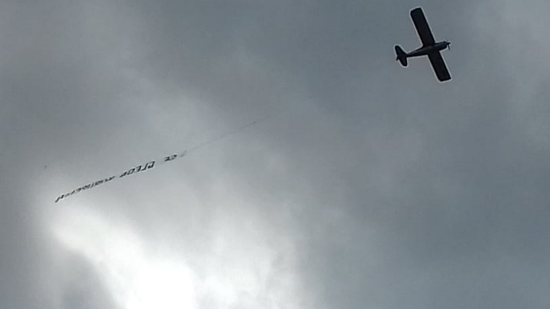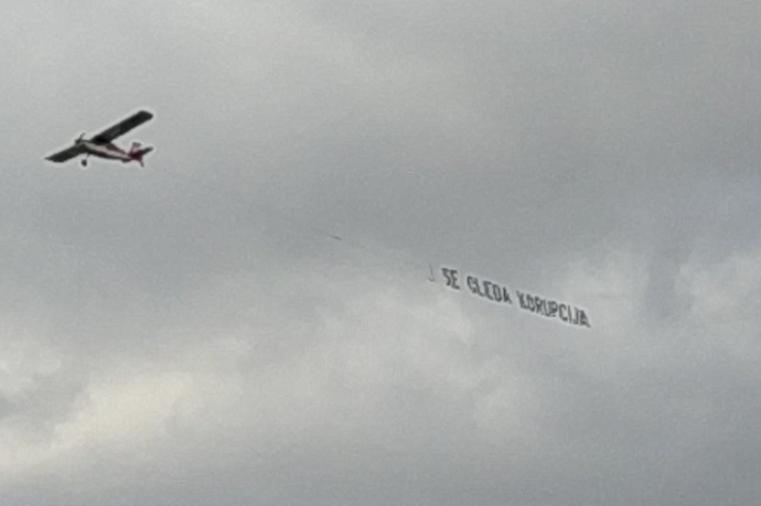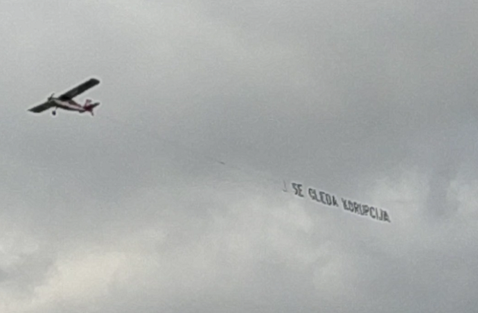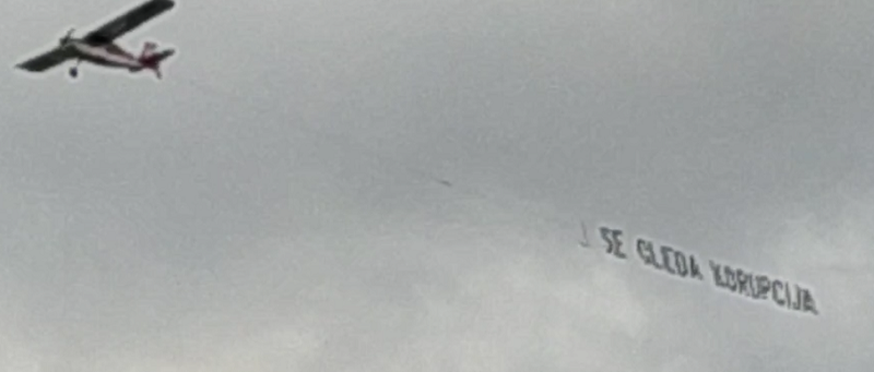 Авион со транспарент „Се гледа корупција“ денеска два часа го надлетуваше Скопје. Граѓаните ја препознаа порката „(Од авион) Се гледа корупција“ и дадоа огромна поддршка на социјалните мрежи. Споделуваа фотографии, снимки со мобилни телефони, коментари дека Македонија 30 години е заглавена во корупција на секој чекор.