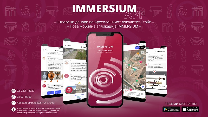 Во античкиот театар на археолошкиот локалитет Стоби кај Градско од денеска до петок ќе биде промовирана новата мобилна апликација Immersium. Станува збор за интерактивна дигитална алатка што овозможува уникатно културолошкo искуство низ истражување, едукација и забава на археолошкиот локалитет. Влезот е слободен за сите заинтересирани и активностите ќе се одвиваат од 8 до 15 часот.