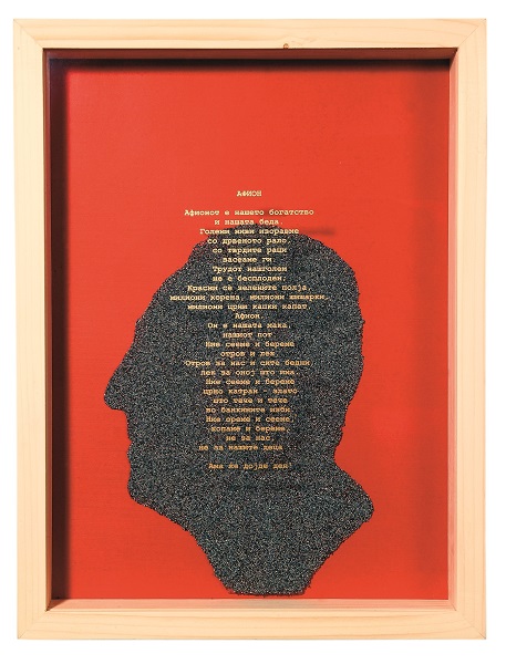 „Афион“, сито печат, картон во боја и семе од афион, 45х30х7см., 2001 (од изложбата „Сеќавање на еден идеалист“)