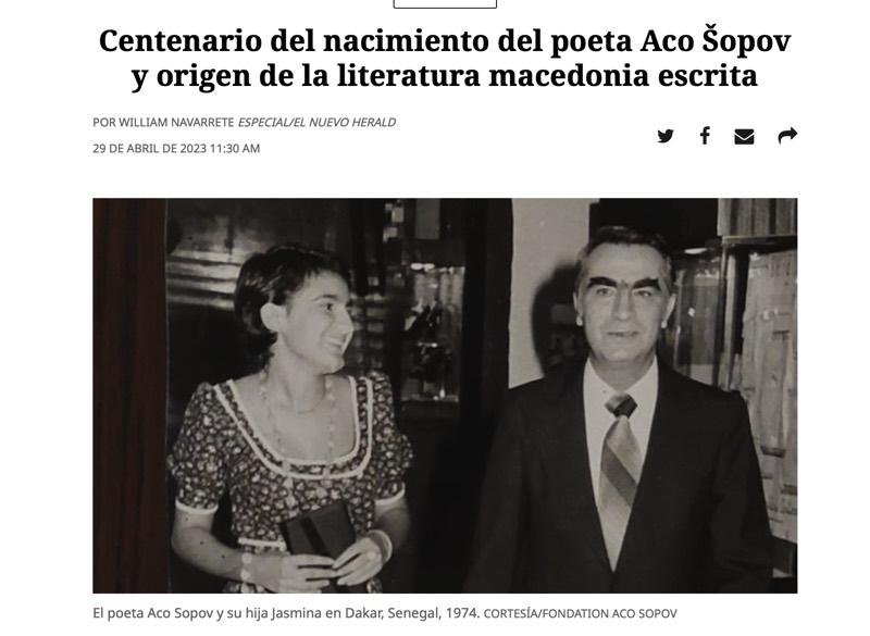 Статијата на Вилијам Наварет, се осврнува и на чествувањето на Ацо Шопов во УНЕСКО, на 21 март годинава, што се одржа во рамки на „Годината во чест на Ацо Шопов“, под покровителство на претседателот Стево Пендаровски, во соработка со Министерството за култура. Весникот најавува и некои од следните моменти на „Годината во чест на Ацо Шопов“, како фестивалот на анимиран филм Флипбук во Скопје и Струшките вечери на поезијата. Објавена е во печатената како и на интернетската страница на Ел Нуево Хералд (https://bit.ly/3HquC9z), во која статијата може да се слушне и во аудиоверзија.