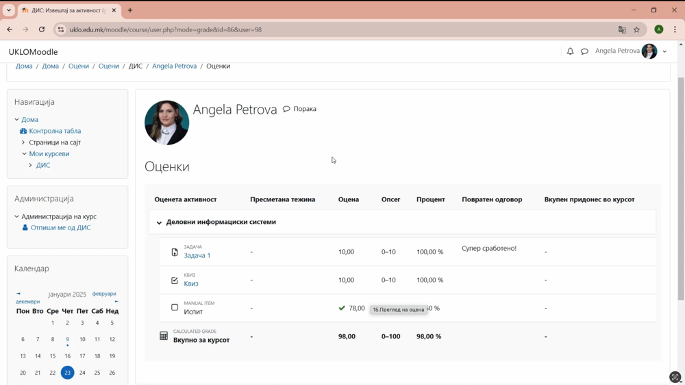 – Како ментор на студентите кои работеа на развој на првиот курс-микроквалификација „Научете Моодле”, имам исклучително позитивни впечатоци. Студентите се покажаа многу мотивирани и посветени на задачата, што беше јасно видно преку нивниот напредок и креативност во изработката на видео туторијали за клучните функционалности (за студенти и професори) на платформата Моодле. Менторството вклучуваше изработка на план за развивање на курсот, давање насоки, активна комуникација и редовно давање на повратни информации, што доведе до успешна реализација на заеднички поставената цел. Како ментор особено ми беше задоволство да следам како студентите извршувајќи ги планираните задачи се стекнуваат и со нови вештини потребни за да го изработат курсот „Научете Моодле”.