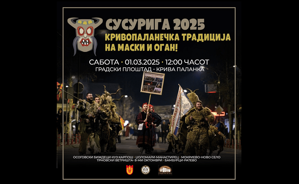 – Во чест на стариот кривопаланечки обичај ќе биде изведено ритуално палење на оган, негово прескокнување и црнење на лицето што е повеќевековна градска кривопаланечка традиција наречена „сусурига“ – велат организаторите.