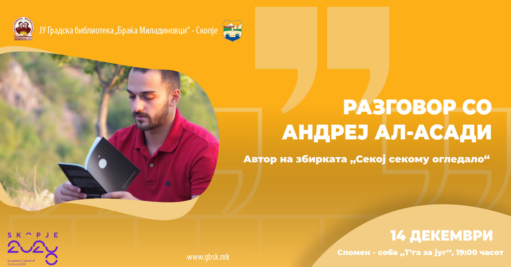 Во Градската библиотека „Браќа Миладиновци“ во Скопје вечерва во 19 часот ќе се одржи разговор со поетот Андреј Ал-Асади, чија …