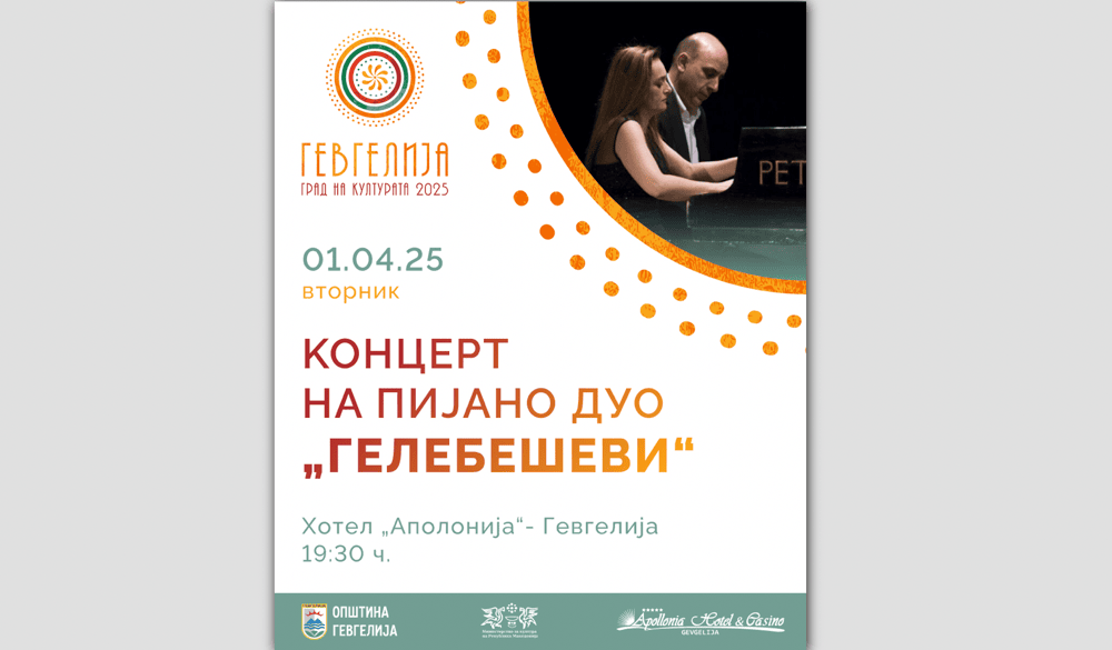 Пијано – дуото „Гелебешеви“ вечерва во 19.30 часот ќе одржи концерт, во хотел „Аполонија“ во Гевгелија. На концертот, ќе бидат …