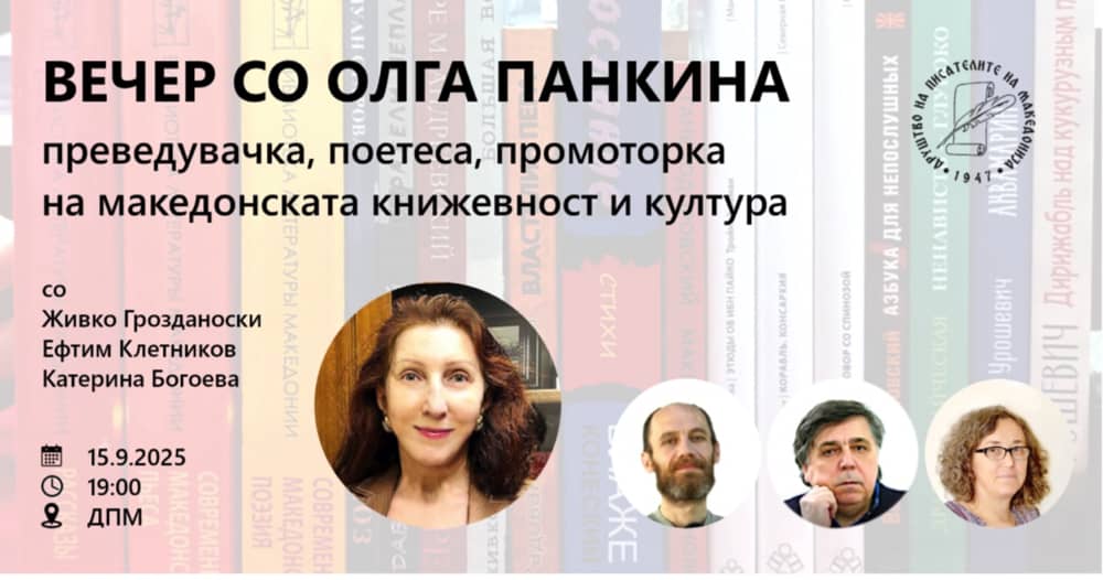 Во Друштвото на писателите на Македонија вечерва во 19 часот, ќе се одржи „Вечер со Олга Панкина“ – преведувачка, поетеса …