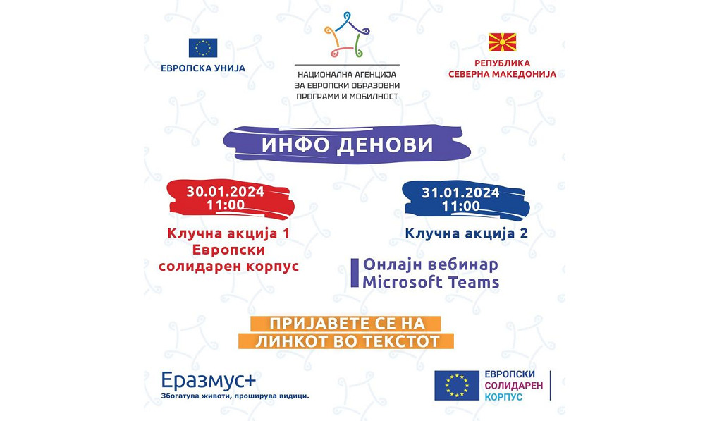 Информативните денови за програмите Еразмус+ и Европски солидарен корпус за оваа година ќе се одржат онлајн на 30 и 31 …