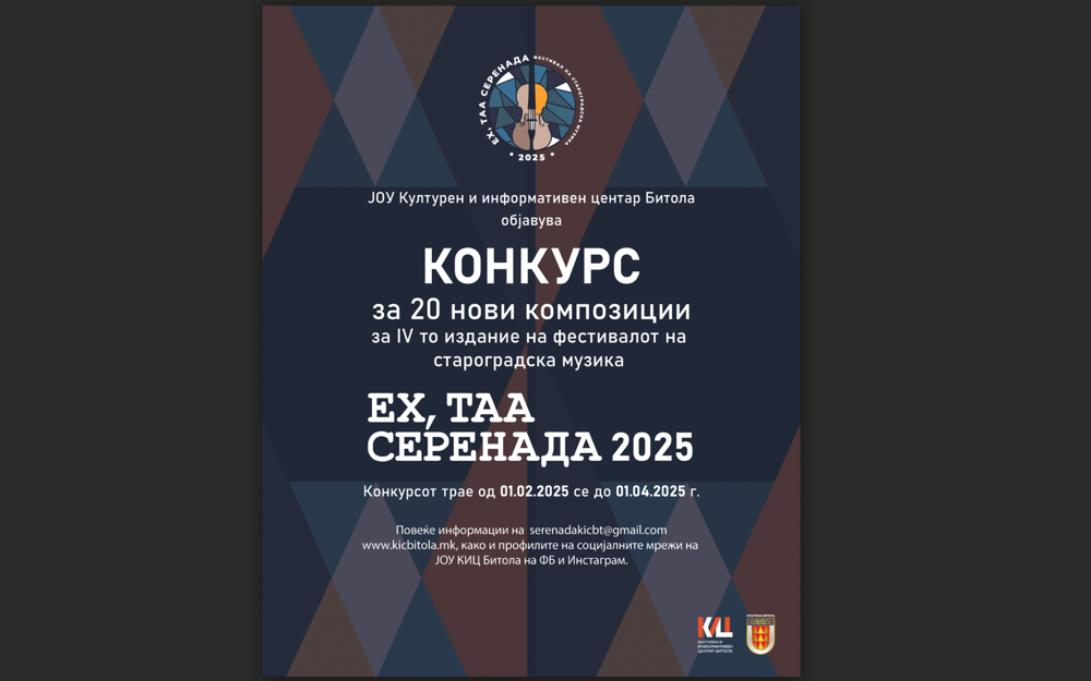 Културниот и информативен центар – Битола објавува конкурс за 20 нови композиции, од кои три дебитантски за потребите на 4. …