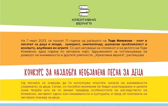 Здружението за поттикнување на развојот на книжевноста и другите уметности „Креативна верига“ објави конкурс за најдобра необјавена песна за деца …
