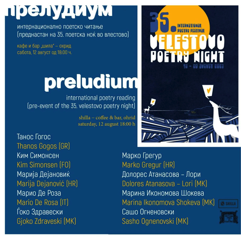 Интернационално поетско читање „Прелудиум“ ќе се одржи вечерва во 18 часот во кафе-бар „Шила“ во Охрид. Станува збор за преднастан …