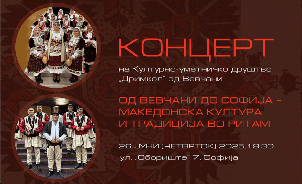 Во Македонскиот КИЦ во Софија вечерва во 18.30 часот концерт ќе одржи Културно-уметничкото друштво „Дримкол“ од Вевчани. Насловот е „Од …