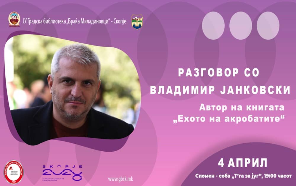 Во Градската библиотека „Браќа Миладиновци“ – Скопје вечерва во 19 часот ќе се одржи разговор со писателот и преведувач Владимир …
