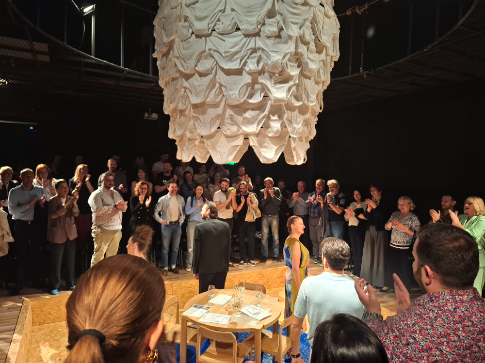 Лустер од еден куп бели машки гаќи ве пречекува на сред малата сцена. Маса, столчиња, фотелја, стар транзистор и по …