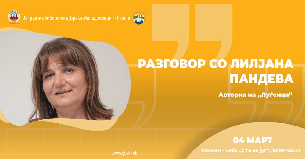 Во Градската библиотека „Браќа Миладиновци“ во Скопје вечерва во 19 часот ќе се одржи разговор со авторката Лилјана Пандева, чија …