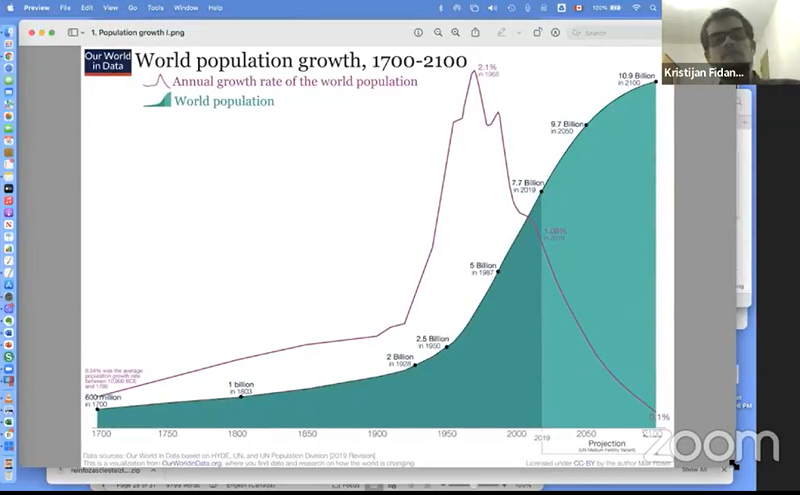 – Но, експанзијата почнува кон крајот на 19 и прва половина од 20 век и во 1968 година ја достигнува најголема брзина. Популацијата сè уште расте и се зголемува. Но, како што светот се развива, наталитетот почнува да опаѓа. Бројките се високи само во земјите во развој. Во Западна Европа наталитетот веќе е опаднат драстично, а тоа ќе се случи и во Источна Европа. Така, полека треба да се префрламе од загриженост поради преголема населеност, кон грижа поради брзото стареење на населението – објаснува Фидановски.