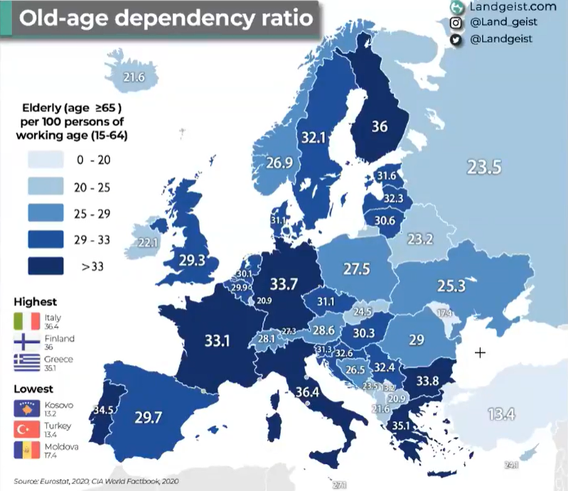 Во однос на наталитетот и работоспособното население, идеалниот сооднос е 1 стар човек на 4 работоспособни. Некои држави го имаат постигнато. Во Македонија сè уште не е алармантно бидејќи неколку децении подоцна почнал да опаѓа наталитетот, но одиме во тој правец. Кај државите кои последни влегоа во ЕУ, Бугарија и Романија, иселувањете е уште поизразено.