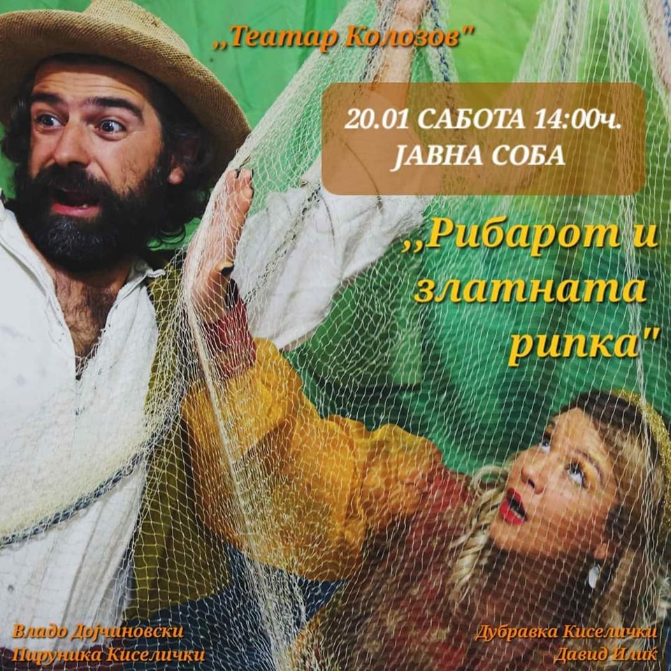 Во 14 часот ќе имате прилика да ја проследите „Рибарот и златната рипка” по истоимената сказна на А. Пушкин преточена во прекрасно, незаборавно, театарско доживување. Претставата е наменета за деца над три години и трае 45 минути. Улогите ги толкуваат: Владо Дојчиновски, Пируника Киселички, Дубравка Киселички и Давид Илиќ.