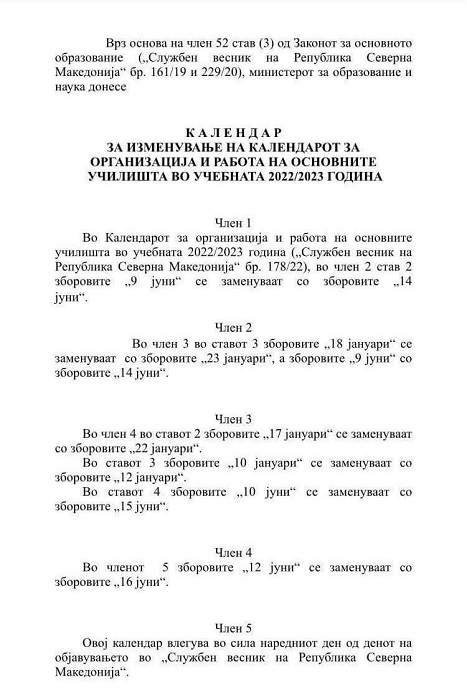 Учебната година за учениците од основните училишта ќе заврши на 14 јуни, а за средношколците – на 9 јуни, велат од Министерството за образование и наука. Измената е објавена со Календарите за изменување за организација и работа на основните и јавните средни училишта. Второто полугодие од наставната 2022/2023 наместо на 18, почна на 23 јануари. Според календарот за работа во образованието, до крајот на учебната година треба да се одработат 180 наставни денови.