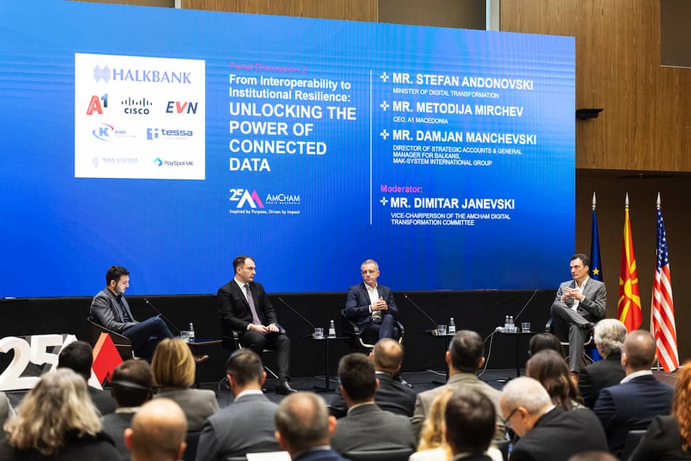 Следеше панел-дискусија каде министерот за дигитална трансформација Стефан Андоновски, заедно со Методија Мирчев од А1 и Дамјан Манчевски од MAK-SYSTEM, зборуваа за поагилна интероперабилност во рамки на институциите и во односот со бизнис секторот, како и потребата од имплементирање на веќе донесената регулатива и постојната дигитална инфраструктура. Говорниците се осврнаа и на важноста на јасните стандарди, координацијата и заштитата на податоците во создавањето модерни јавни услуги.
