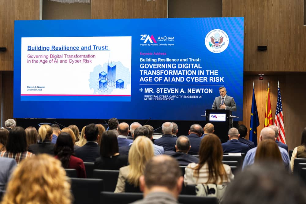 Третата годишна конференција за дигитализација во организација на Американската стопанска комора во Македонија (АмЧам) со работен наслов „Од визија кон акција: Креирање на систем што испорачува“ се одржа вчера, акцентирајќи ја темата за потреба од дигитална трансформација која е практична, безбедна и функционална. Конференцијата ја отвори Славко Пројковски, член на Одборот на директори на АмЧам, кој ја даде и рамката на самата конференција истакнувајќи дека иако нашите животи секое утро почнуваат пред екран, тоа не значи дека сме дигитално напредни. Пројковски нагласи дека вистинската дигитализација не смее да создаде „10 дигитални чекори таму каде што претходно имало 10 хартиени“. Таа мора да ја отстрани бирократијата, да ги решава секојдневните проблеми, да штеди време и да гради доверба.