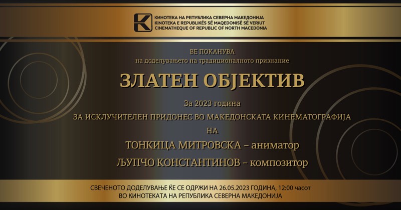 Во Кинотеката денеска на пладне ќе бидат врачени признанијата „Златен објектив“ на Тонкица Митровска, аниматорка и Љупчо Константинов, композитор на филмска музика. Кинотеката, традиционално по повод својот роденден на 29 април, секоја година го доделува признанието „Златен објектив“ на филмски работници, кои преку својот професионален ангажман придонеле за создавањето, развојот, промовирањето и популаризацијата на македонската кинематографија.