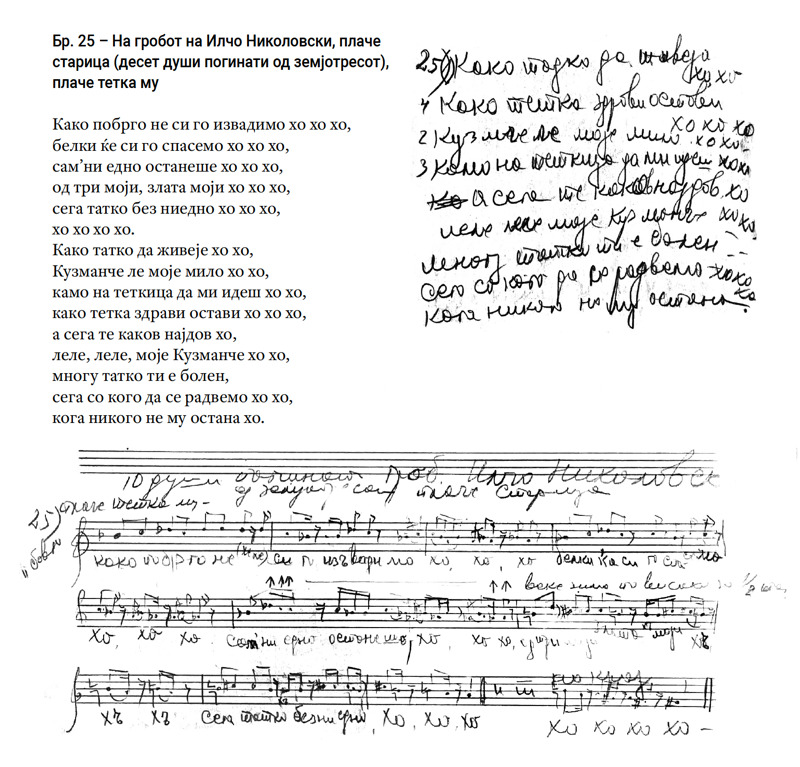 -Тие користат типични почетоци и завршетоци на песните, рефрени, извици, лелеци итн. Во тажачките песни од земјотресот, сите тие структурно-стилистики елементи ги има, но заради специфичните околности на колективна трагедија импровизацијата е уште поочигледна. Тажаленките се испеани во растревожена емотивна состојба заради противприродната смрт, тие се лично обоени, но сепак ги почитуваат правилата и востановените матрици на градење на овие народни песни. Несомнено најголемата разлика е во тематската основа, па имаме песни со мотиви за барање на жртви под урнатините, за потресни призори на осакатени тела, за куќите во пламен и пепел итн., додека останатите елементи од песните и мелодиски и композициски и стилистички и симболички се во духот на традиционалната тажачка песна на македонскиот народ – објаснува Иванов.