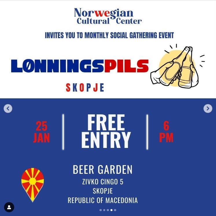 – Ова е денот кога колегите излегуваат на пиво, често на денот кога добиваат плата или набргу потоа. Кај нас ќе се организира секој последен четврток во месецот – објаснува Марина Терповска-Штарго, амабасадор (претставник) на Норвешкиот културен центар за нашата земја.