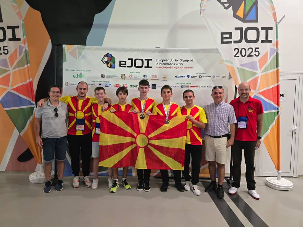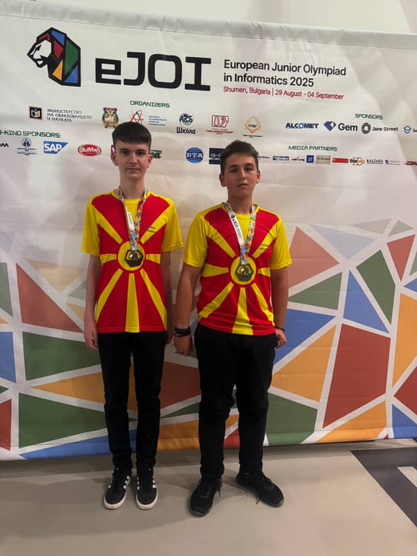 Златен и бронзен медал освоија македонски ученици на 9. Европска јуниорска олимпијада по информатика (ЕЈОИ 2025), која од 29 август до 4 септември се одржa во Шумен, Бугарија. Златен медал на овој најпрестижен интернационален натпревар во програмирање за ученици на возраст до 15,5 години го освои Владимир Грчев од Кочани, а бронзениот медал го освои Марко Кренков од Струмица. Членови на македонскиот тим беа уште и Зоран Илијоски од Кичево и Јаков Грујовски од Скопје. Тимот беше раководен од лидерите, Иван Занов и Петар Ковачовски, студенти од Факултетот за информатички науки и компјутерско инженерство (ФИНКИ).